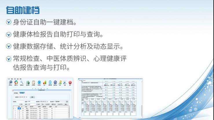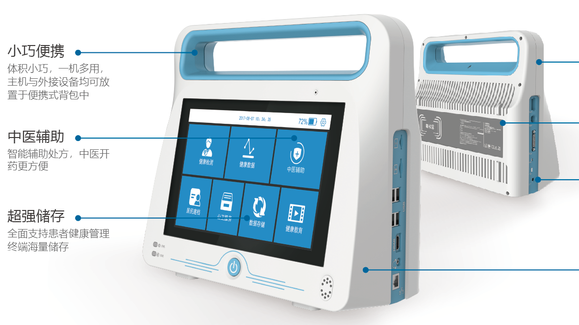 支持智能監(jiān)測設(shè)備接入,進行數(shù)據(jù)的長期追蹤、分析與評估。數(shù)據(jù)按及地方標(biāo)準建立,內(nèi)置中醫(yī)體質(zhì)辨識,醫(yī)生可現(xiàn)場分析中醫(yī)體質(zhì)。